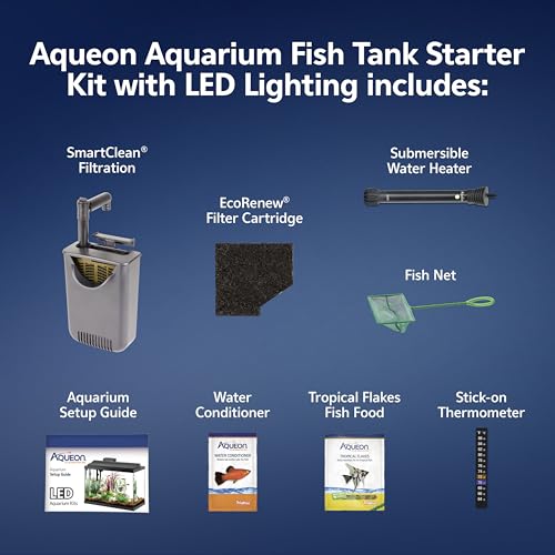 - KIT INCLUDES: glass aquarium, low profile LED hood, SmartClean internal power filter size small, EcoRenew filter cartridge size medium, submersible preset heater 50W, premium fish food sample, water conditioner sample, fish net, thermometer and setup guide