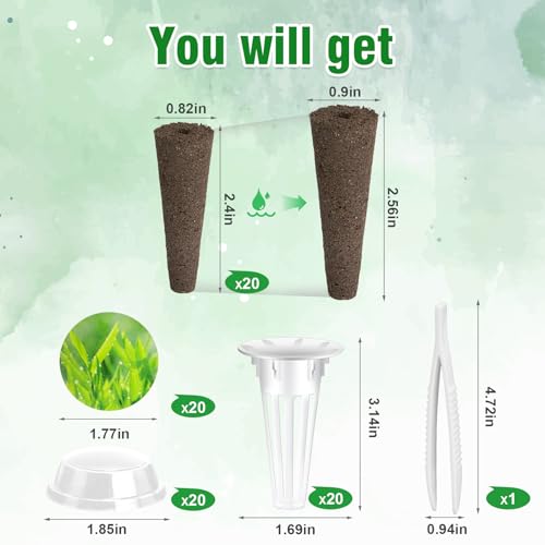 • ?YOU WILL GET?:We offer a great value hydroponics growing system kit. You will get 20 Grow Sponges, 20 Grow Baskets, 20 Grow Domes, 20 Pod Labels and 1 Tweezers. The planting baskets and domes are made of high-quality plastic material that is sturdy, durable and can be washed and reused.After soaking in water,the pod sponge measures 2.56 (H) * 0.9 (D) inches