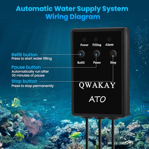 - Smart ATO System: This Smart Automatic Top Off System is a great choice for your home fish tank. Auto Top Off System has an intelligent alarm system that will trigger an alarm when the water bucket is out of water, the water tank is leaking, the float is stuck, the water replenishment times out, the water pump is not connected, or there is a short circuit, allowing you to quickly find the problem.The working voltage of this auto water filler is only 12V, which is energy-saving and safe.
