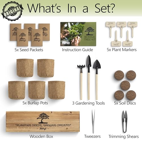 AVERGO Bonsai Tree Kit – 5X Unique Japanese Bonzai Trees | Complete Indoor Starter Kit for Growing Bonsai Plants with Tools & Planters – Gardening Gifts for Women & Men