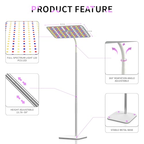 - Floor Grow Light with Adjustable Stand:This grow light lamp with a stable metal base that allows you to place it on the floor or tabletop and adjust the head height from 12″ to 59″ depending on your application. The flexible gooseneck can rotate 360 degrees, allowing you to easily adjust the height and angle you need to suit your plants!