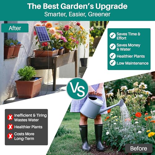 - Solar-Powered & Battery Backup: The smart solar drip irrigation system with built-in 2200mAh battery automatically switches between solar and battery power, ensuring reliable watering day and night – no electrical outlets needed! Perfect for remote garden beds, balconies, and eco-conscious gardeners looking to reduce their carbon footprint
