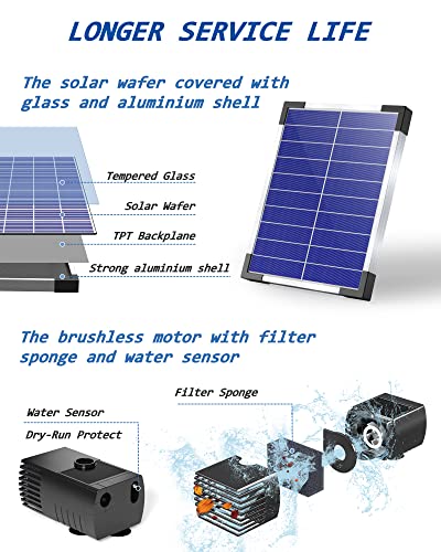 - ECO-FRIENDLY AND RELIABLE SOLAR PANEL KIT: Our solar powered fountain adopts 100% glass solar panels with stronger light transmittance. The solar panel will not oxidize even if used outdoors for a long time, It can steadily absorb the sun's energy and make the water spray more stable and lasting.