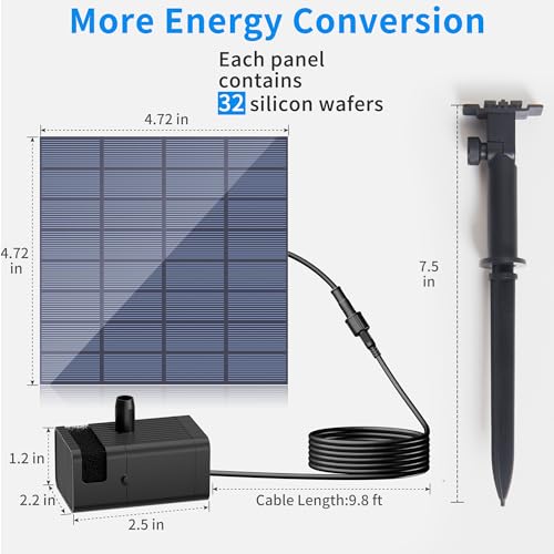 - DIY SOLAR WATER PUMP KIT: A complete solar pump kit: includes 2.5w solar panel with stake, a water pump with 9.8 ft cord. Can be used in bird bath fountains, fish tanks and water features to create a vibrant ecosystem and make your garden look inviting.