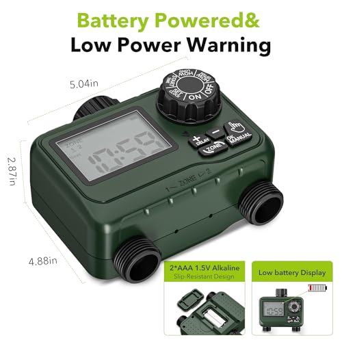 - ?Wide Compatibility & Convenient Battery Power?Compatible with 3/4-inch hose threads and a water pressure range of 0.5bar to 8bar (7-116PSI), this timer works with most outdoor irrigation systems. Powered by 2 AA batteries, it’s easy to install and requires no external power source, making it an ideal choice for lawns, gardens, and yards.