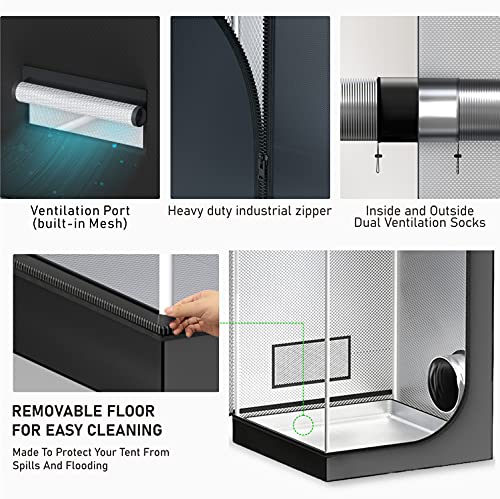 - [Grow Tent]:100% Water-Resistant Removable Mylar Floor Tray for easy cleaning, 2 Filter Straps and 1 user manual. Mesh Vents and Floor Tray: Air circulation is conducive to the growth of plants; water-resistant removable floor tray and easy cleaning