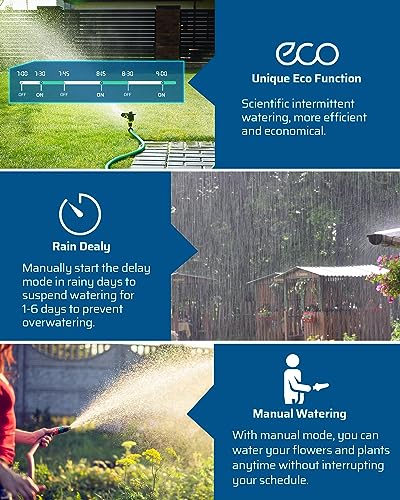 - ?Repeat Watering Mode?-An innovative design, it will ON/OFF in cycle between scheduled period, such as at 15:00-20:00, ON 5 minutes, OFF 15 minutes, and repeat in cycle until switch to another mode, this flexible design could meet your special needs under certain circumstances like lawn sprinkler or garden pots in early stage of growth