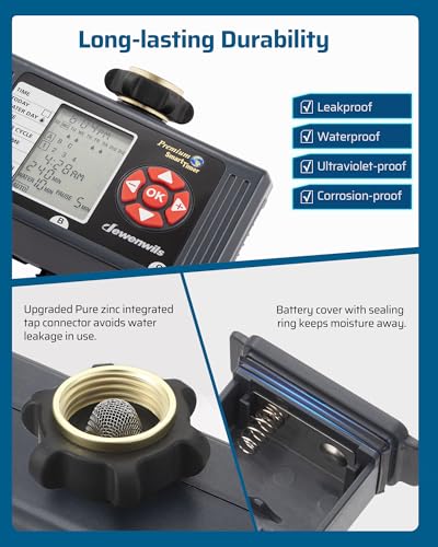 - ?Leak-proof for Outdoor Use?Pure zinc integrated tap connector without extra gaskets installation,support standard 3/4 outdoor water faucet and avoid water leakage in use, ABS plastic shell sunscreen and waterproof in outdoor use; the hose timer itself do not generate pressure, while its max sustainable water pressure is 120 psi, tap water or a pressurized water source ensures a normal drain