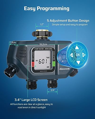 - [User-friendly] Featuring a 3.4-inch LCD screen, this faucet timer offers a simple and intuitive user interface; all functions are clearly displayed with accompanying explanatory text on the left, providing comprehensive details; the flashing cursor on the screen and 5 program buttons enable users to effortlessly achieve various watering cycles