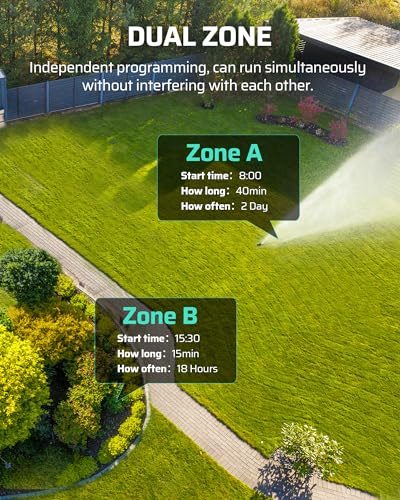 • [2 Separate Watering Zones] Faucet timer has 2 independent watering outlets, each zone can be programmed individually without interfering with each other, up to 12 different watering schedules can be set to meet your abundant watering needs