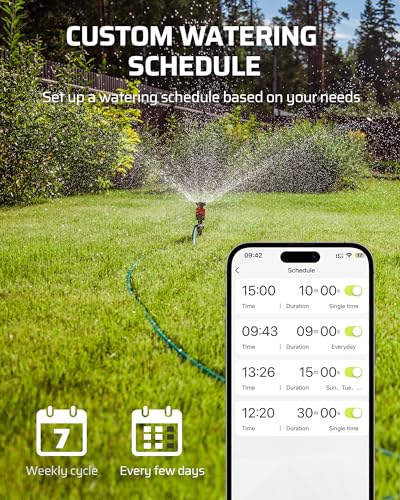 • [Rain Delay & Manual Watering] With smart & manual rain delay watering function, avoid over-watering when you are away from home (Smart Delay: According to weather conditions, Manual Delay: 1-7 Days); for manual watering mode, selectable 1-60 mins without changing pre-set schedule, convenient for your temporary irrigation