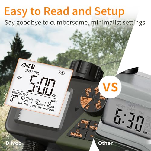 Diivoo Sprinkler Timer 2 Zone, Programmable Water Hose Timer 2 Outlet for Garden, Outdoor Automatic Irrigation System IPX5 Waterproof with Rain Delay/Manual for Lawn, Yard, Pool