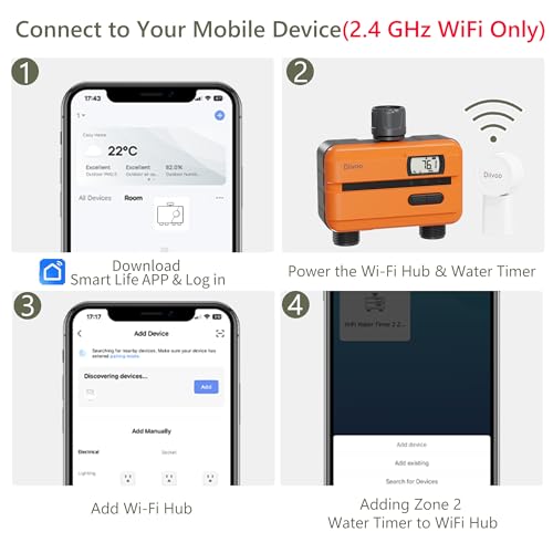 - WiFi Hose Timer: Add the smart water timer to the gateway via the Smart Life APP(Only supports 2.4 GHz WiFi,the gateway and the water valve exceeds 49.2 feet), you can create a watering schedule in the app anytime and anywhere. Don't worry about watering your garden when you are away. Supports only 2 AA 1.5V alkaline batteries. (Batteries Not Included)