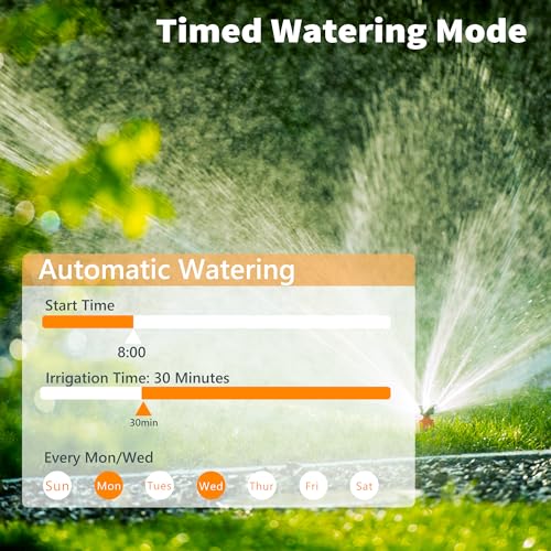 - Timed Irrigation Mode: Smart hose timer can be programmed with a timing schedule that allows the timer to operate on its own and water at a specified time. Even offers up to four different watering modes for you, for example, watering on days of the week at a specific time, or watering on a schedule of odd days, even days or every few days for a month