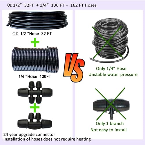 - ?EASY TO ASSEMBLE? Upgraded automatic drip irrigation watering system, all kits are installed without heated hoses, you just need to cut the hoses as required and link the required hose fittings, easy to build your own garden plant watering system.