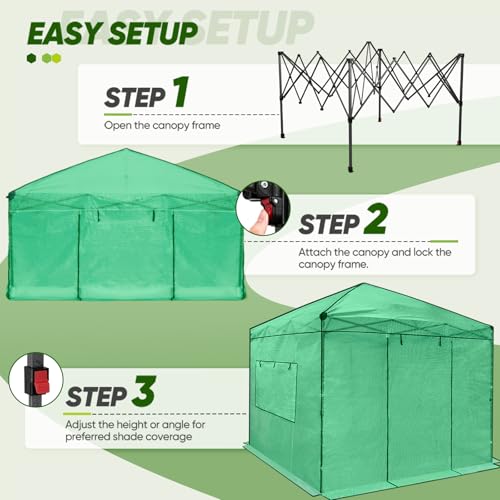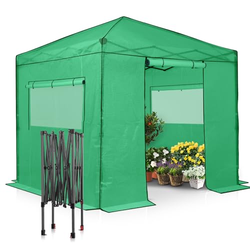 EAGLE PEAK Instant Pop-up Greenhouse, Indoor Outdoor Plant Gardening Green House, Roll-Up Zipper Doors and Side Windows, Walk in 8×8 ft, PE Cover, Green/Clear