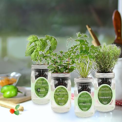 Environet Hydroponic Herb Growing Kit Set, Self-Watering Mason Jar Herb Garden Starter Kit Indoor, Grow 4 Kinds of Herbs from Seeds (Basil, Mint, Cilantro & Rosemary)