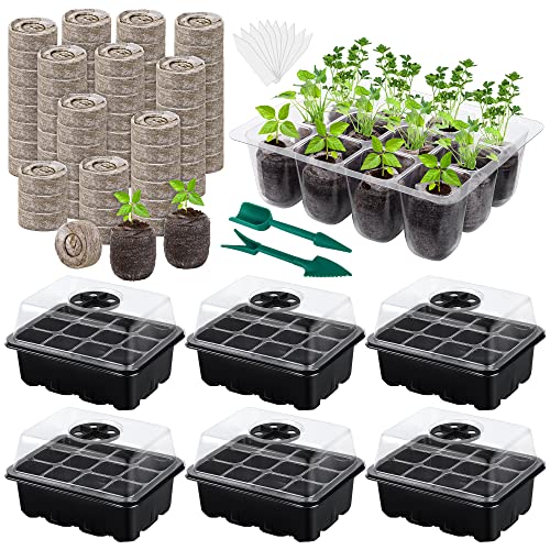 Hahood 6 Pack 12-Cells Seed Starter Tray Kit with Humidity Dome and Base, Germination Tray Including Peat Pellets, Plant Labels, Tool, Plastic Plant Seedling Starter Trays for Indoor Outdoor, Black