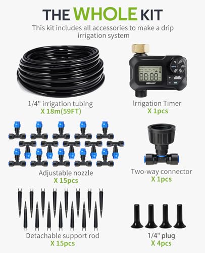 - Accessory List: The irrigation system kit contains 1Pcs timer, 59FT 1/4" irrigation tubing, 1Pcs two-way connector, 15Pcs adjustable dripper, 15Pcs detachable support rod, 4Pcs 1/4" end plug, without having to buy any more tools