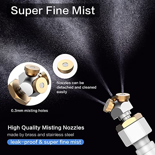 - 3-Way Super Fine Misting Coverage – Our misters for outside offers wider coverage with three nozzles facing different directions. Each nozzle features a 0.3mm calibrator, producing a super fine mist that cools you down without getting you wet.