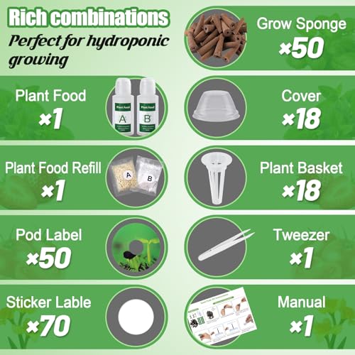 - Package Contents: You will receive 50 grow sponges, 1 A&B plant food, 1 A&B plant food refill, 18 plant baskets, 18 covers, 50 pod labels, 70 sticker labels, 1 tweezer and 1 manual.