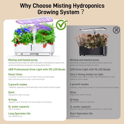 - Hydroponics growing system 15 Pods comes with 3 growing modes (seedling, vegetative, and flowering),you can customize 0-24 hours LED lighting schedule to match plants growth stages,misting hydroponic system has more space for growing,perfect for indoor use or apartment living,mothers day gifts for mom