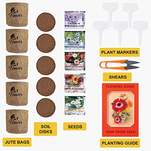 - FLOWER GROWING KIT: Package comes with 5 jute bags, 5 plant markers, 5 soil disks, 1 mini shears, and 1 planting guide. This flower growing kit is super easy to start, and ideal for gardening beginners and daisy flower planting lovers.