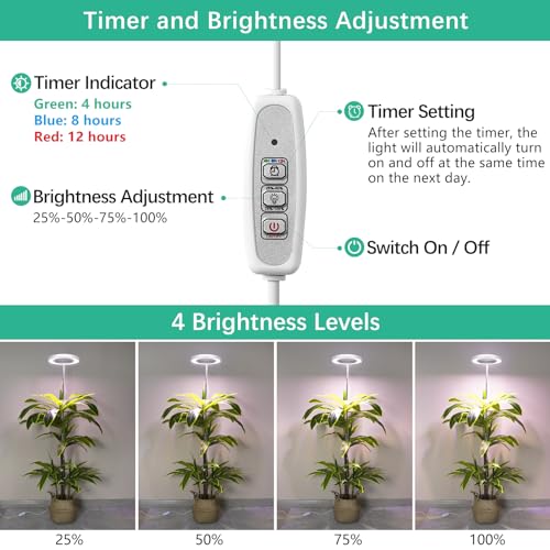 - Brighter Grow Light with 4 Brightness Settings: Our newest upgraded growing light, the diode arrangement gathered into a circle, makes the PPFD more uniform, allowing plants to absorb light better, and grow happier. Also, it has 4 dimmable brightness settings(25%-50%-75%-100%) to meet different kinds of plants with different requirements for light intensity.