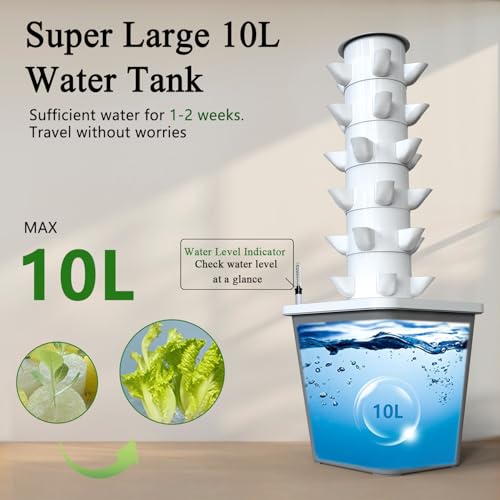 - What's in the box: The vertical hydroponic tower is made of food-grade plastics that are BPA-free and comes with tower section x6, 10L water tank x1, timer x1, water pump x1, power adaptor x1, water level gauge x1, foldable funnel x1, filter x1, hose x1, shower cap and shower cap lid x1, manualx1 and growth spongex64. Serving you is our biggest purpose. If you have any questions about the product, please contact us at any time. Our technical team will solve the problem for you within 24 hours