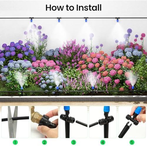 • [Advanced Misting Watering System]The MIXC Misting Watering System kit offers top-notch features for convenient and efficient plant care. Each kit includes:100ft 1/4'' irrigation tube*1,Blue Mist Nozzle *15,Quick connector tee*15,Fixed inserting rod*15,Single outlet faucet*1,End plug*5,Nylon zip tie *10