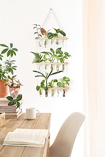 Mkono 3 Tiered Wall Hanging Plant Terrarium with Wooden Stand, Glass Planter for Hydroponic Plant Cutting, Home Garden Office Decor, Gift