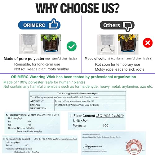 - ??Size & Material?60 feet long, 1/6 inch diameter. Made of 100% polyester, Not rot or decay for long-term repeated use. Safe for human and plants, Not contain any harmful chemicals. ORIMERC self-watering string has been tested by professional organization: PH Value is 6.7, 100% polyester without any other material, does NOT contain any harmful chemicals such as formaldehyde, heavy metal, arylamine, azo etc.
