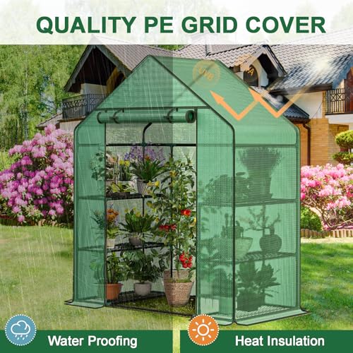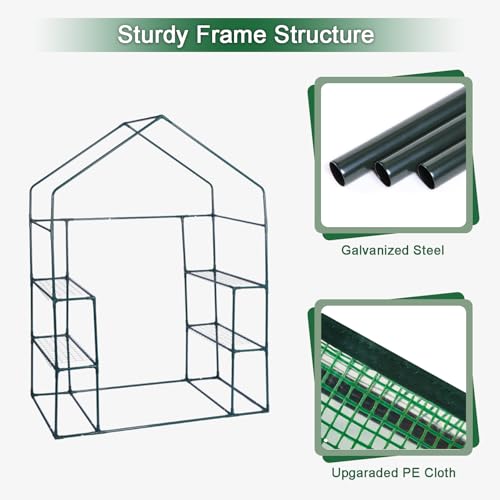 • ?High-Quality Waterproof PE Canopy?The walk-in tunnel greenhouse comes with Reinforced 140g/m2 PE grid cover can protect your plants from ultraviolet rays, rust, snow, and rain all year round. The size of the cover fits the frame closely, enhancing the warmth and wind resistance,The PE cover is odorless, so you can work in the green house without worry