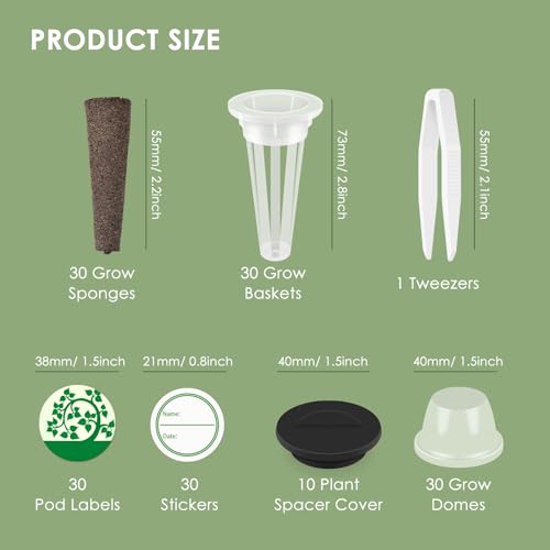 - ?? What You Will Get?-You will get 161pcs hydroponic growing kit, including 30pcs grow songes, 30 grow baskets, 30pcs grow domes, 30 Pod Labels, 10pcs plant spacer cover, 30pcs stickers and 1 tweezers. Meet all the accessories for the hydroponic system!