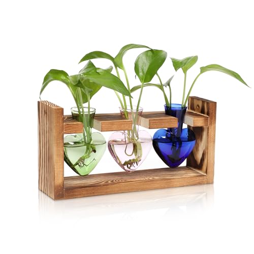 Plant Terrarium Propagation Stations Hydroponics Home Garden Decoration Gift for Women with Wooden Stand Heart Shaped Colored Glass Vase