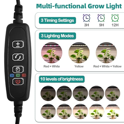 - MULTI-FUNCTIONAL SWITCH: The plant light has 10 kinds of adjustable brightness to meet the light needs of plants at different stages. 3 Timing Modes can be set 3H, 6H, 12H .3 Lighting Modes is a great choice for indoor garden or small greenhouse.