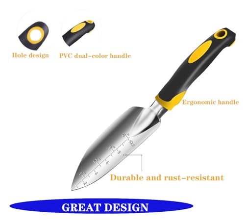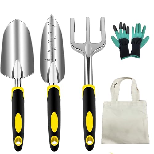 • ? Complete Gardening Essentials Includes 5 rust-proof tools: heavy-duty hand trowel (8" blade), depth-marked transplanter, 3-prong hand rake, dual-claw gloves, and a reinforced canvas tote bag. Perfect for planting, weeding, soil aeration, debris cleanup, and transplanting delicate seedlings.