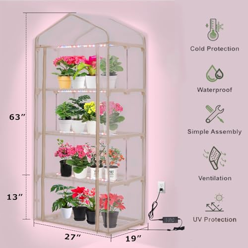Purlyu Mini Greenhouse with Grow Light , 4 Tier 27.2" ×19.9" ×61.8" Portable Greenhouse with Zippered for Seed Starting Trays , Dimmable 2ft 60W Plant Light for Indoor Plant with Timer(PLGH704OWPT)