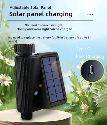- ?Solar Power Smart Water Sprinkler Controller?The wifi smart sprinkler water timer is powered by a solar panel, making it more energy-efficient and environmentally friendly.In case of insufficient sunlight, a USB Type-C port is available for built-in long-life lithium-ion battery charging