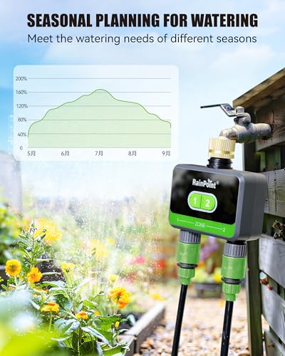 - ?Make Irrigation Easier?The seasonal adjustment feature automatically adjusts the watering duration by the percentage you set (10%-200%) each month, eliminating the need for you to repeatedly adjust your schedule. Smart water timer is compatible with Alexa and Google Assistant for hands-free operation via voice commands.