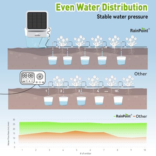- ??EXPERT Dripline Layout??RAINPOINT GEN 2 Drip irrigartion system pioneered a brand new expert irrigation layout: smaller branch line tubing, optimized emitters, and a more powerful pump work together to deliver superior pressure consistency across every plant zone. Equipped with an anti-backflow valve to avoid water distribution deviation caused by siphon effect.