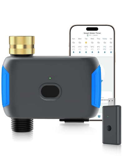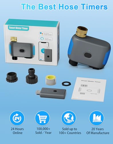 - WiFi & Bluetooth Connection: It comes with a Wi-Fi hub to facilitate connecting to your network which is especially useful if your outdoor faucet or hose bib is too far from your Wi-Fi router to get a good signal. You can manage your watering schedule even if you aren’t home, as long as your phone has access to the internet. It combines Wi-Fi and Bluetooth functions, which means more stable, longer-range connectivity, and allows you to connect your phone via Bluetooth(50ft) in addition to Wi-Fi.