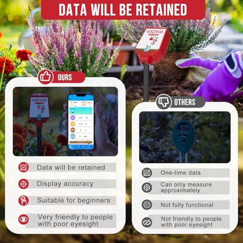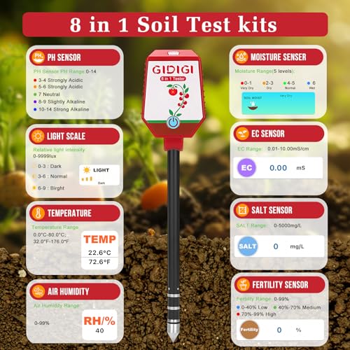 - 8 in 1 Soil Tester:GIDIGI Soil tester kit with 8 functions synchronously,pH tester/EC tester/moisture meter/salinity test/sunlight intensity/fertility/soil temp and air humidity. You only need to connect to Bluetooth to view all the value on your phone.The operation is simple.Soil pH tester digital can more accurately grasp the soil conditions and adjust the watering and fertilization plans in time. Whether it is indoor potted plants or outdoor lawns, they can be scientifically cared for.