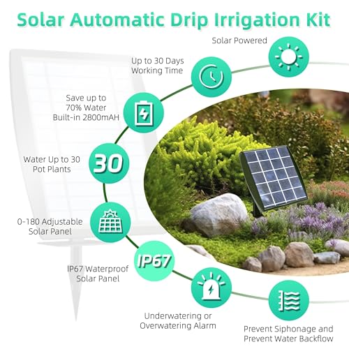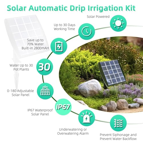 - ?Automatic Drip Irrigation Kit?: This drip irrigation system is powered by solar energy, automatically watering your plants at preset intervals and amounts. It also includes an automatic alarm for water pump idling or water shortage in the container. Ideal for gardens, balconies, raised beds, greenhouses, and potted plants.