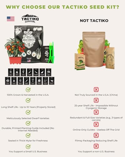 Tactiko Survival Urban Garden Vegetable Seed Kit – 15 Popular U.S.A. Grown Dwarf Seeds for Planting Vegetables – Indoor, Outdoor – Non-GMO Heirloom Gardening Kit for Small Spaces, Balconies & Patios