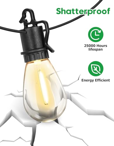 - ?Shatterproof & Weatherproof — The string lights are made of shatterproof plastic and are more resistant to breakage than traditional glass. They have been rigorously tested and can withstand high-intensity weather effects like rain, high temperature, snow and hail. The normal service life is up to 30,000 hours.