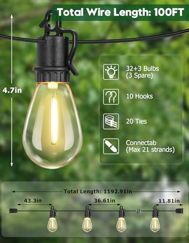 - ?Excellent Outdoor Lights — The whole outdoor string lights are 100FT in length, and the distance between bulbs is 36.6", equipped with 32 shatterproof S14 bulbs (3 spare). The LED outside lights can reduce your 90% electricity consumption compared with incandescent bulbs.