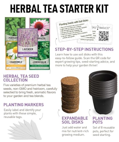 - Complete Herb Growing Kit Indoor – 5 heirloom tea seed packets, biodegradable soil disks, plant markers, and starter pots. Lavender, Chamomile, Lemon Balm, Peppermint and Echinacea heirloom seeds.