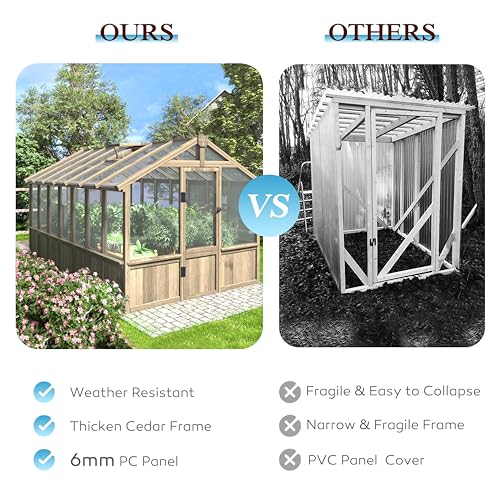 • Sturdy Cedar Frame – The 8x14ft greenhouse adopts thickened cedar frame design, which is more stable and sturdier, and can also enhance the charm of the garden. Due to its excellent temperature regulation function, the walk-in greenhouse can effectively keep heat. When wood is heated by the sun during the day, it will keep this heat at night, which will be beneficial to your energy consumption in the greenhouses, especially in winter.