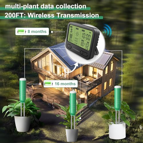 • Long-Lasting Soil Moisture Sensor: Our soil moisture meter is powered by standard alkaline batteries, boasting an impressive 16-month sensor life and 8 months for the display. It’s a reliable garden and indoor plant water meter, perfect for consistent soil moisture tracking.